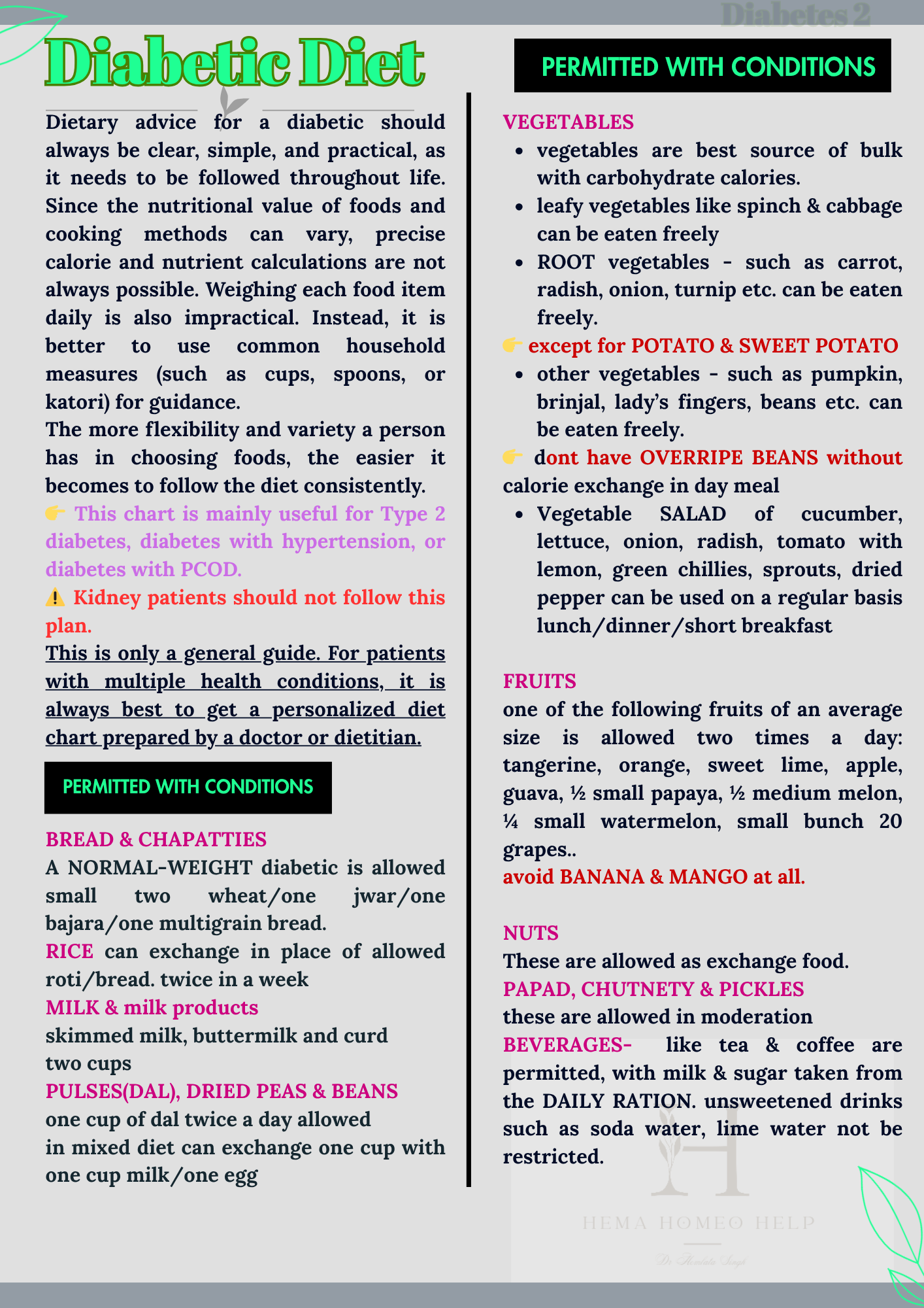 This is only a general guide. For patients with multiple health conditions, it is always best to get a personalized diet chart prepared by a doctor or dietitian.