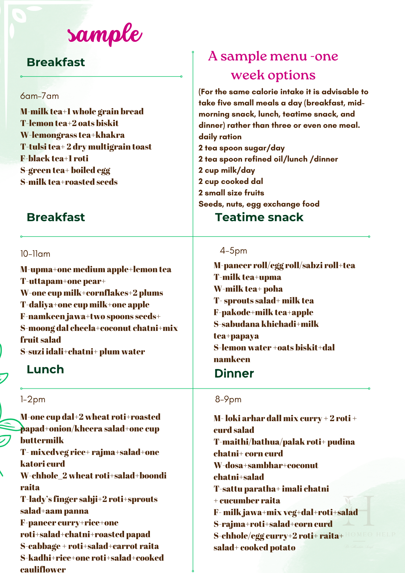 FRUITS – one of the following fruits of an average size is allowed two times a day: tangerine, orange, sweet lime, apple, guava, ½ small papaya, ½ medium melon, ¼ small watermelon, small bunch 20 grapes.. avoid BANANA & MANGO at all.